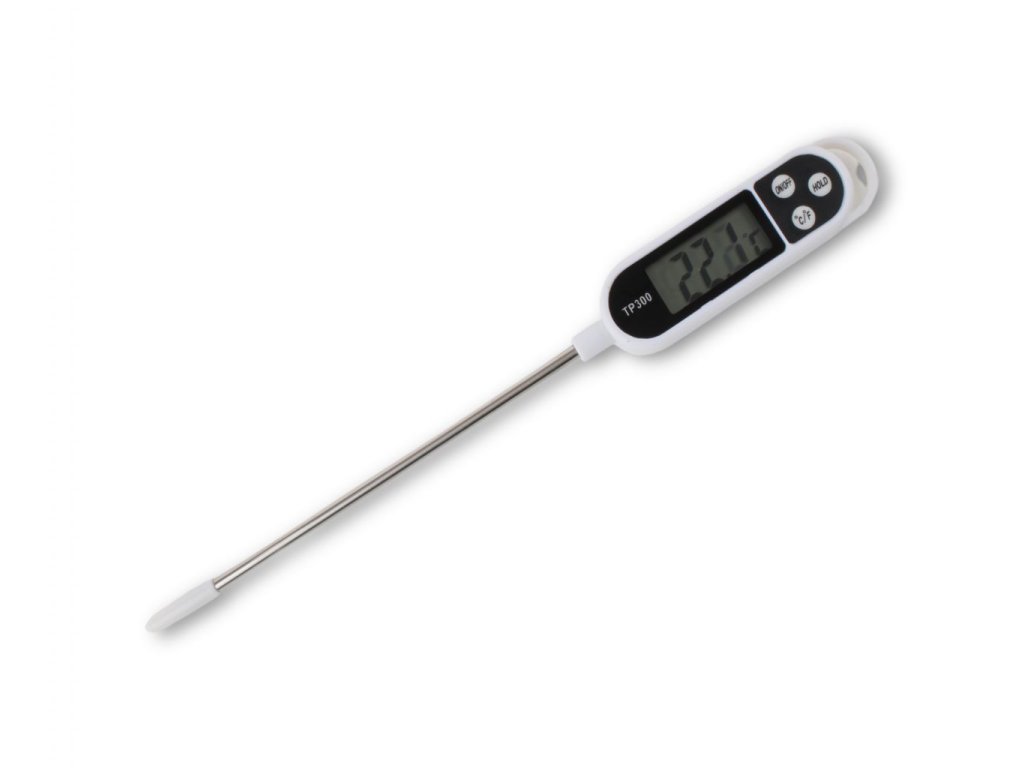 Přenosný teploměr s digitálním ukazatelem naměřených hodnot a s teplotní vpichovou sondou. Tento teploměr je vybaven tlačítkem °C/°F pro přepínání naměřených hodnot °C nebo °F. Hrot kovového čídla teplotní sondy se hodí pro měření v tekutých i pevných látkách. Je určen pro měření teploty v potravině.